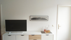 An der Stahltreppe hängen mehrere Bilder aus dem Urlaub im Passepartout mit Alurahmen. Sieht super aus