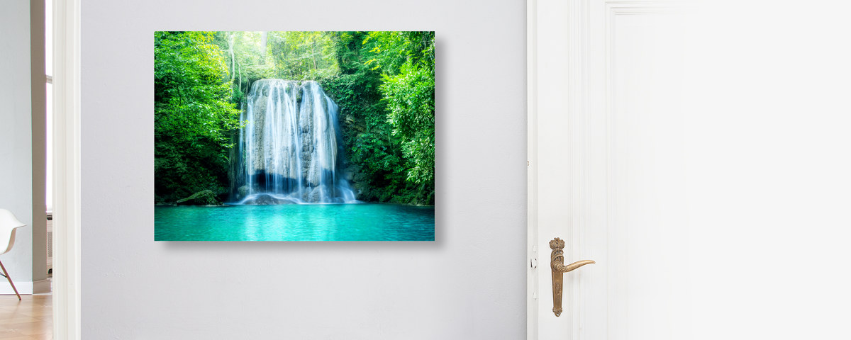 DSCHUNGEL WASSERFALL auf Fotopapier gedruckt, hinter Acrylglas (2 mm) kaschiert und mit einer Aluminium-Dibond-Verbundplatte (3 mm) hinterlegt. Die edelste Inszenierung Deines neuen Motivs als rahmenloses Bild.